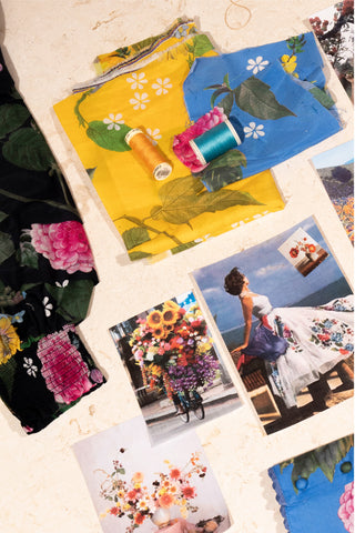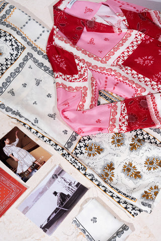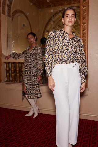 100% silk twill sets, playful ruffles and tailored silhouettes. The ultimate statement print.