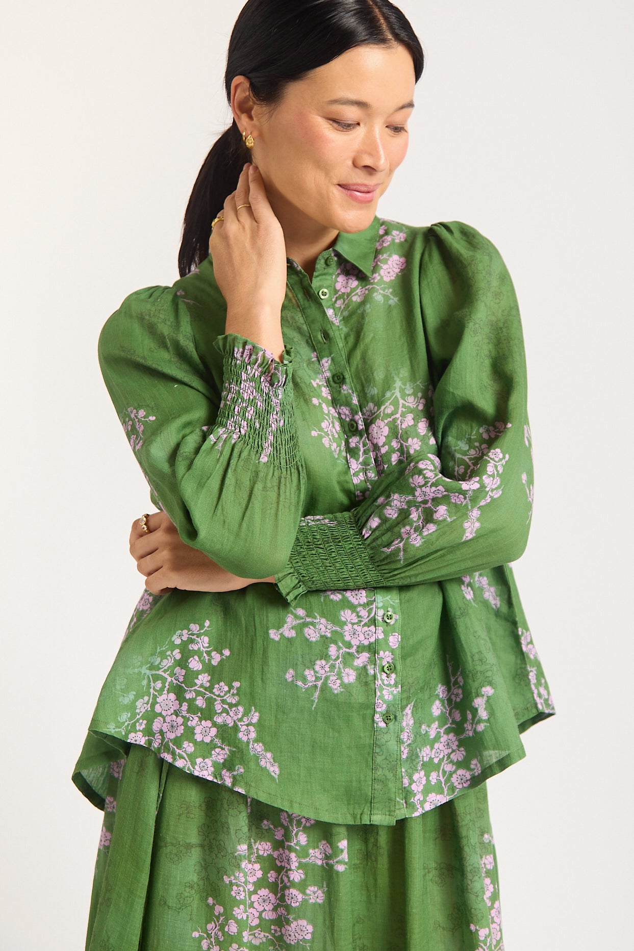 Designer’s Note: Willa has a relaxed fit through the body with soft volume at the shoulders and sleeves. Flaring outwards toward the bottom, It sits loosely through the waist and hips, making it perfect for tucking or wearing loose for a laid-back, feminine shape.