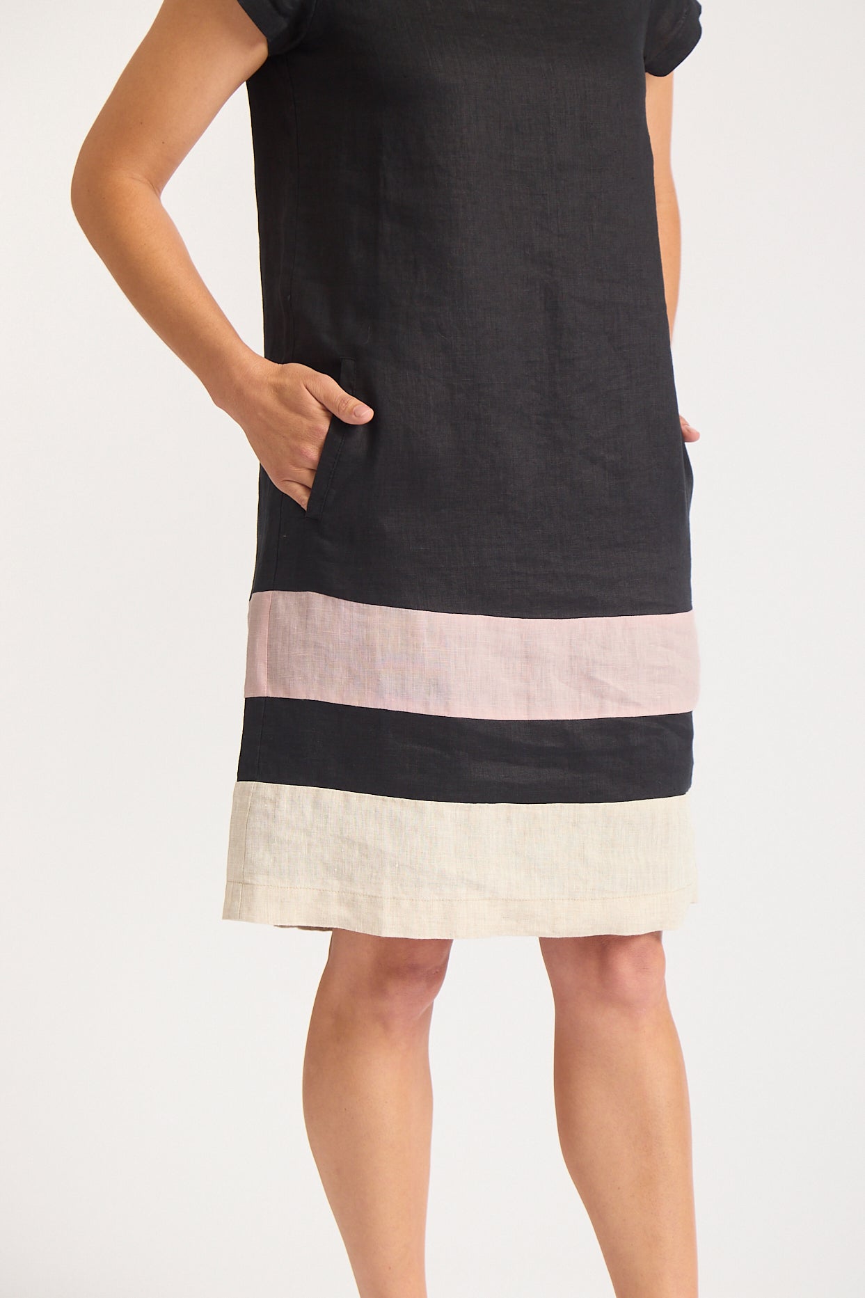 Designer's Note: Knee length, flattering boat neck, cap sleeve, front facing pockets for ease, fully lined, a straight fit. This is a good fit for someone looking for a narrower silhouette, with a relaxed feel.