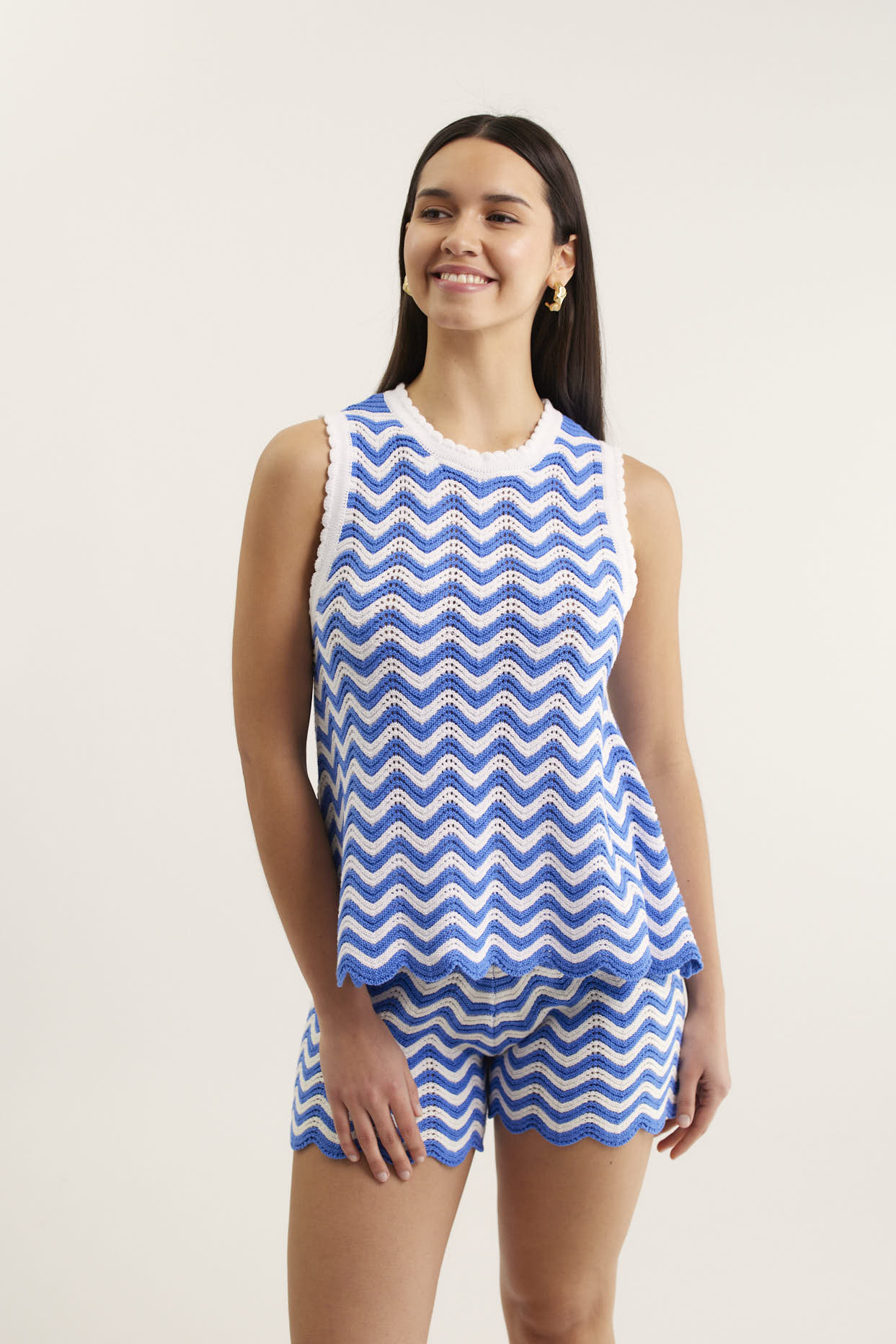 - Scalloped edge finish on neck and sleeves, wave edge finish on hem